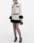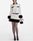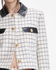 This black and white checkered tweed jacket is crafted from tweed fabric and features a classic check pattern. Soft suede details adorn the cuffs and hem, while the cropped design adds a touch of style. Pair it with a matching skirt and eye-catching accessories to effortlessly elevate the overall look.