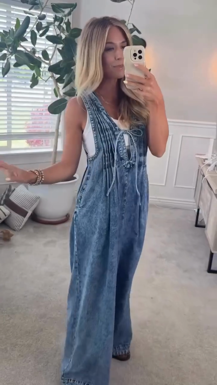 This jumpsuit is made of blue denim, featuring a sleeveless design, pleated bodice, front drawstring, and wide-leg pants. Pair it with a white tank top and sneakers for an effortlessly stylish and casual look.
