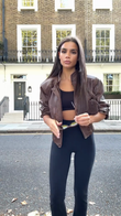 This brown leather moto jacket exudes timeless, edgy appeal. Its structured silhouette, accented with details like a high collar and button fastenings, gives it a distinct moto vibe. The rich brown color adds a touch of sophistication and versatility, making it a must-have for any outfit.
