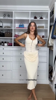 This cream-colored midi dress features a sleeveless silhouette with a fitted V-neckline, exuding simple elegance. Ruched details at the waist and along the front zipper add a sophisticated, modern touch, enhancing the dress's silhouette.