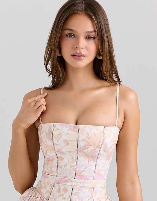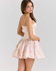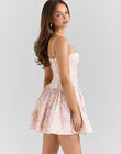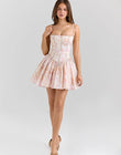 This mini dress features a corset-style bodice with a sweetheart neckline and spaghetti straps for a feminine yet structured look. The soft, elegant floral print adds a touch of romantic sophistication, while the flared skirt lends a playful, voluminous silhouette.
