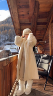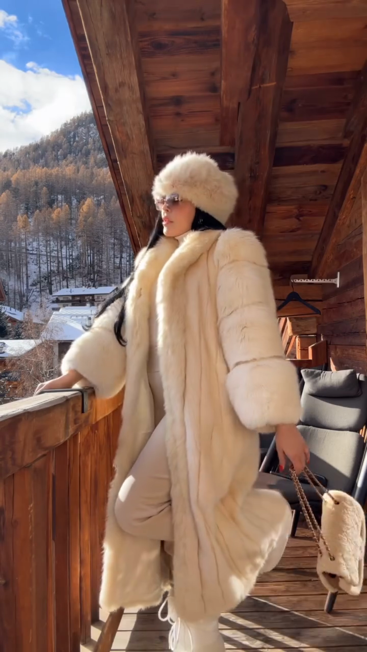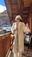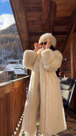 This coat is crafted from soft ivory faux fur. Its relaxed, elongated silhouette, paired with a wide lapel, exudes elegance. Create a sophisticated winter vacation look by pairing it with a matching ivory turtleneck sweater, faux fur hat, and white boots.