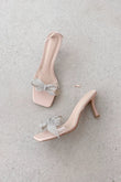 Introducing the Jasmina Heel by Billini—a stunning choice for those who love to make a statement. Featuring a mid-kicked stiletto heel and an open square toe, these heels are both chic and contemporary. The clear vinyl toe strap elegantly showcases a statement oversized diamante mesh bow, adding a touch of glamour.