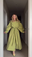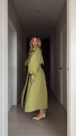 This light green trench coat features an oversized silhouette with exaggerated shoulder detailing and wide cuffs for a striking, modern look. This classic trench coat design features an adjustable belt at the waist for a cinched effect.