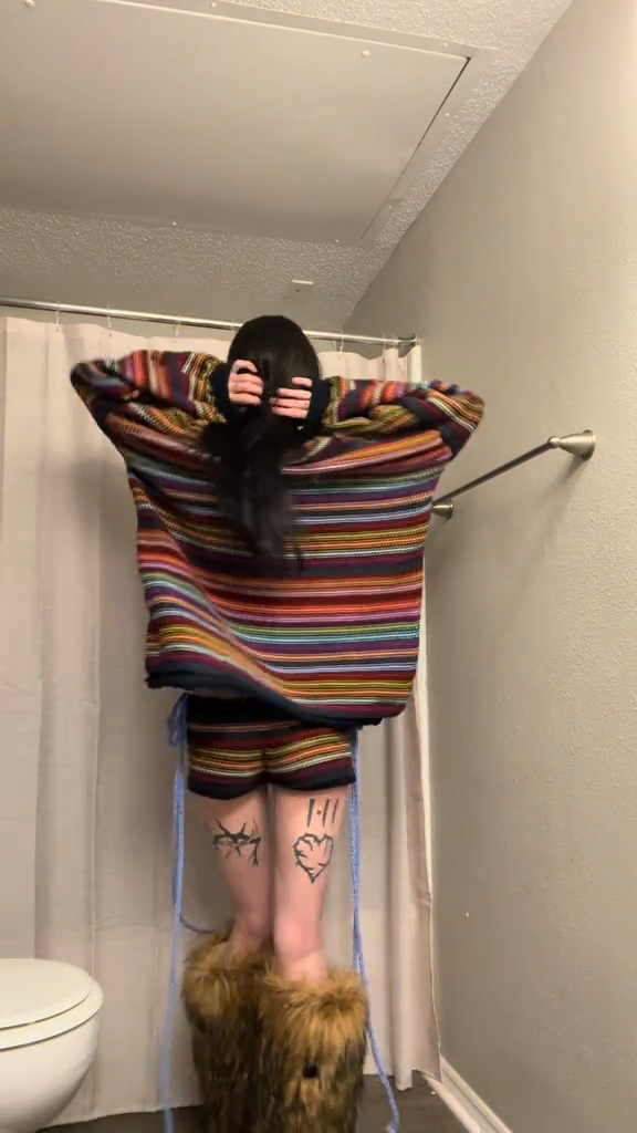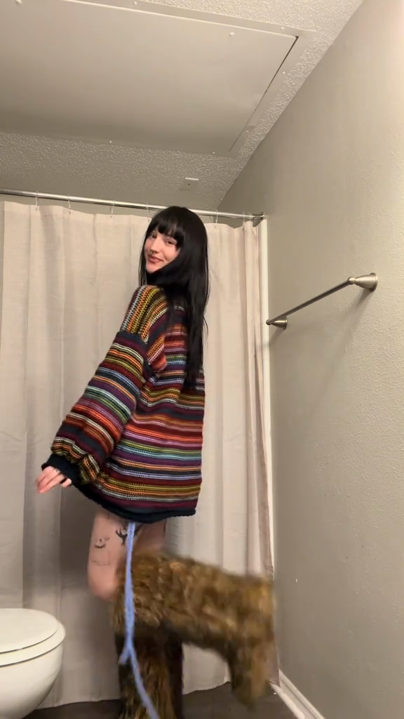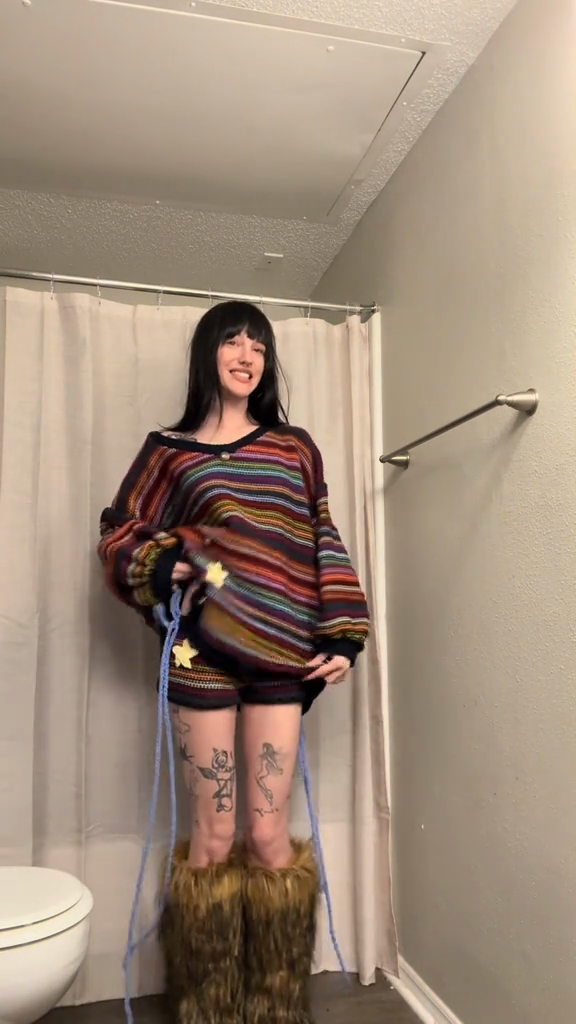 This striped knit set is casual, comfortable, and colorful, making it ideal for relaxed outings. Pair it with furry boots and sophisticated accessories for an effortlessly stylish look.