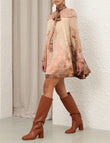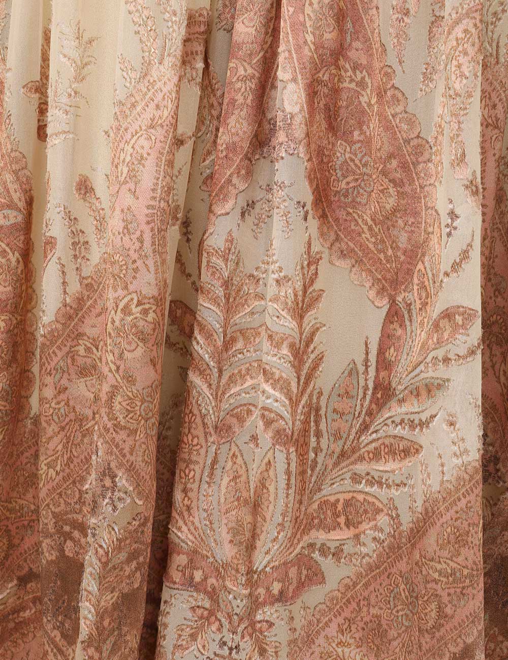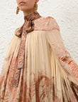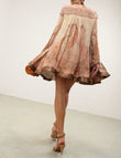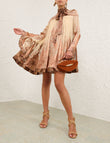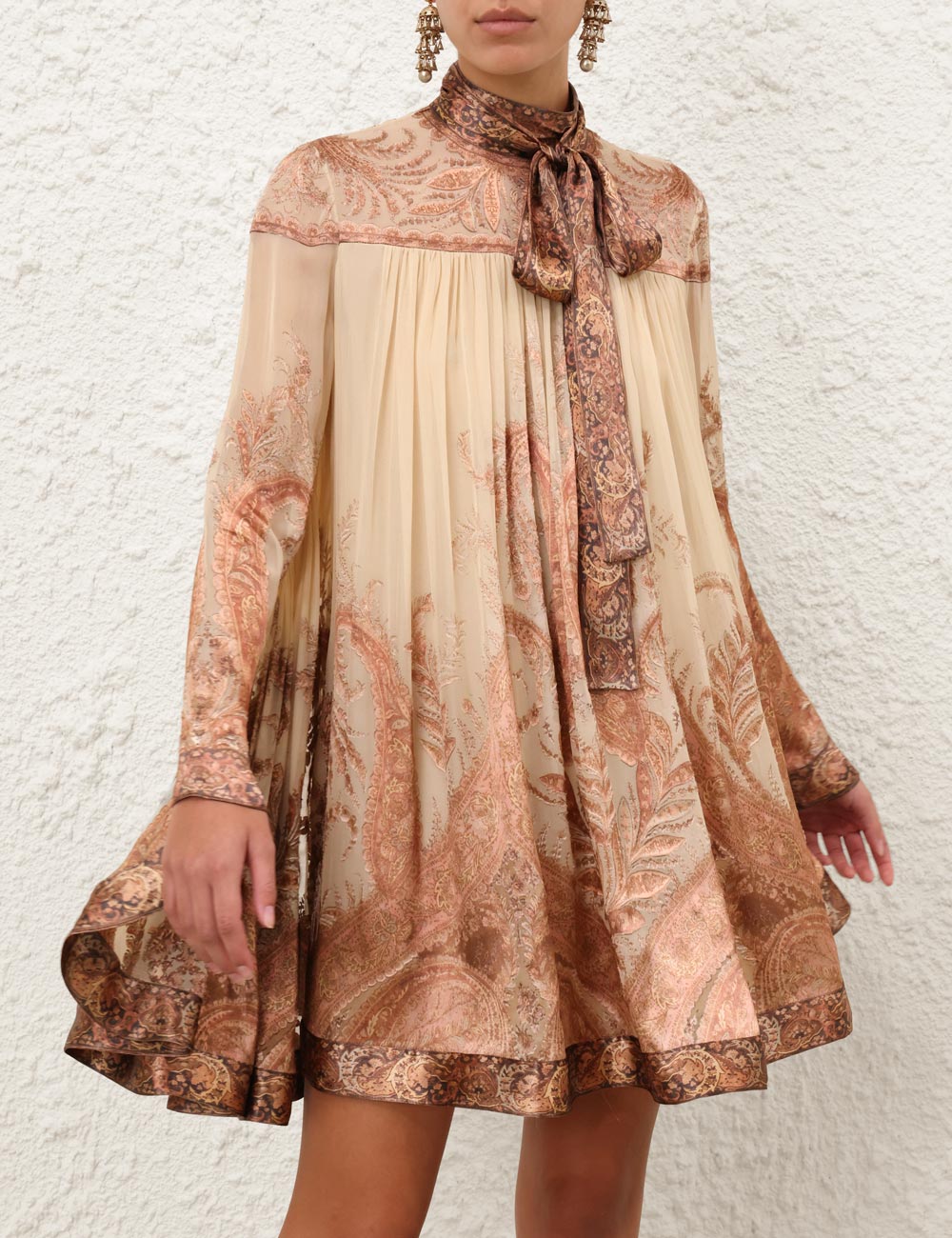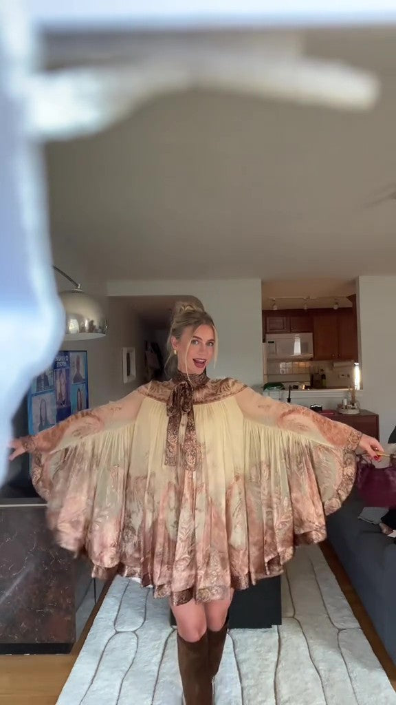 Newly released in cream, this paisley batwing sleeve mini dress features a pussy bow tie, batwing sleeves, and heavy ruching.