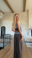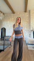 This outfit features a polka-dot one-shoulder top, adding a touch of playfulness and fashion. Unique draping details and gold accents add a touch of modern allure. The matching brown wide-leg pants create a balanced look, perfectly blending comfort with a stylish silhouette.