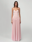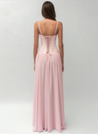 The Amelia Dress is soft, romantic, and sculpted to flatter. Designed with a V-shape drop waist silhouette, it features structured cups, thin adjustable straps and a lace-up back for a snatched fit. The gathered full-length skirt adds graceful movement, while the matching chiffon scarf completes the look. Elegant, feminine, and made to stand out.