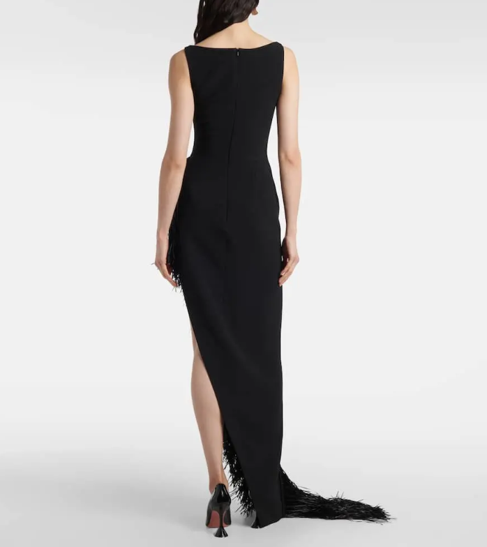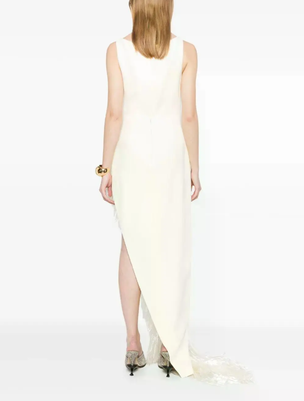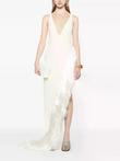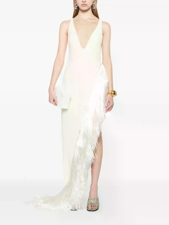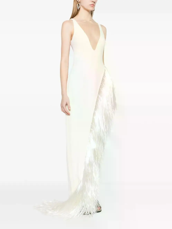 This maxi dress features a plunging V-neckline for a glamorous, sophisticated look. Long, flowing fringe drapes down one side for added movement.