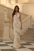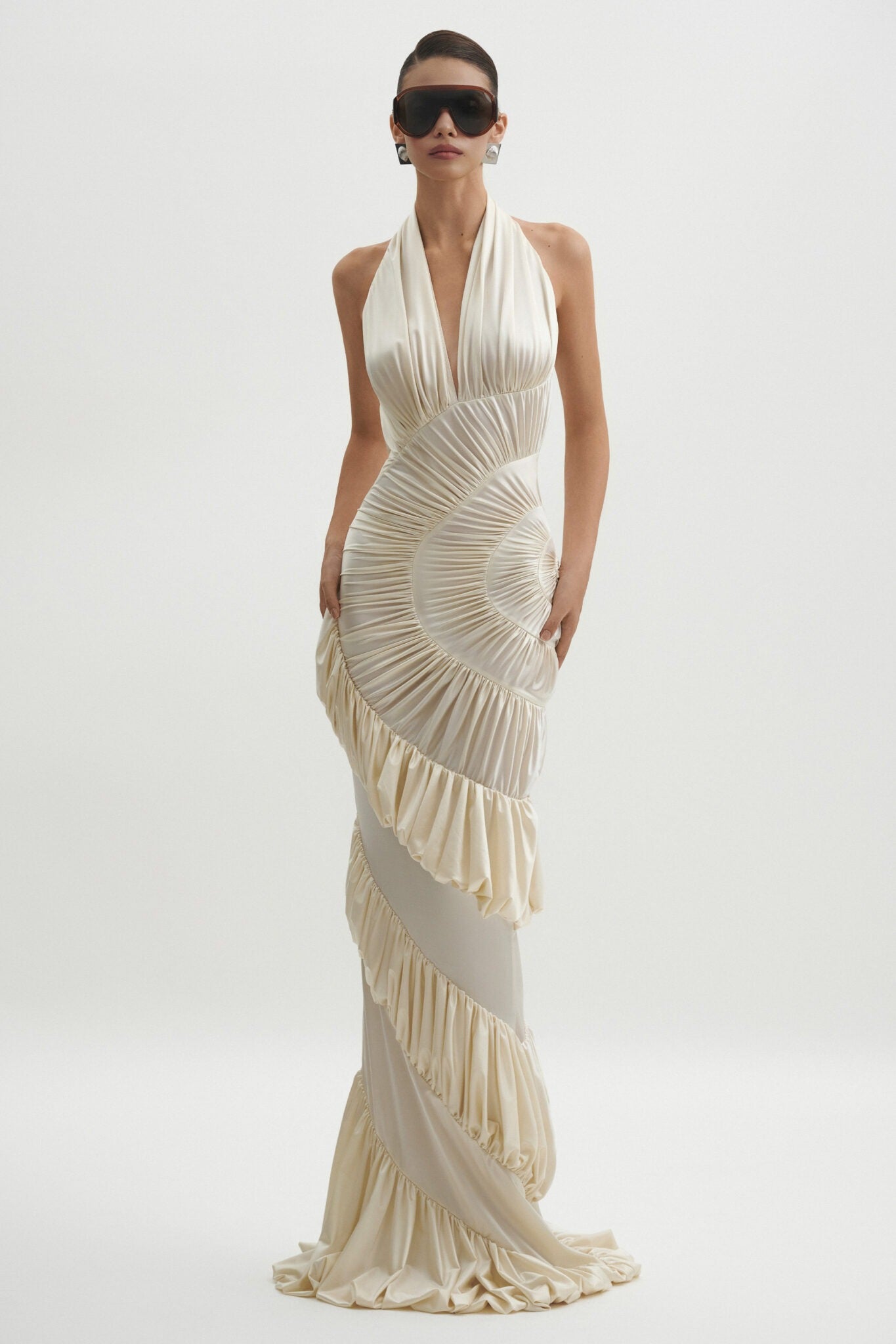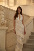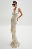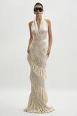 Cream Halter Neck Shirred Maxi Dress