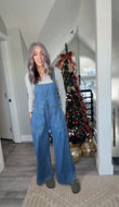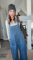 These denim overalls are made from classic washed denim, featuring a relaxed, wide-leg fit with adjustable shoulder straps and buckles. Pair them with a light gray long-sleeved T-shirt and a beanie for an effortlessly comfortable and casual everyday look.
