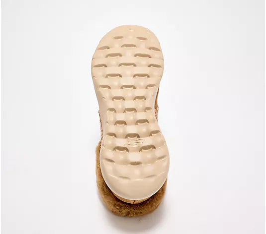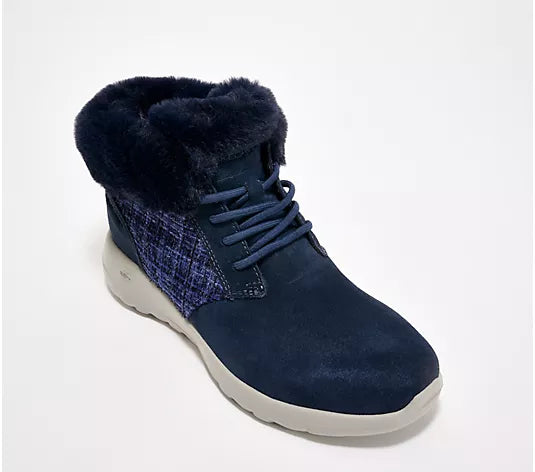 Waterproof upper, slip-on design, suede upper, adjustable laces, quilted collar details, faux fur trim, reinforced heel