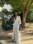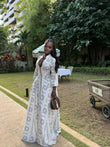 This white maxi dress features an intricate black geometric abstract pattern throughout. The plunging V-neckline and long sleeves add a touch of glamour and sophistication. The row of buttons on the front is both practical and aesthetically pleasing.