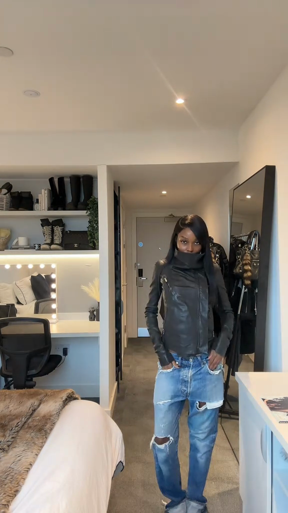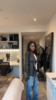As shown, it pairs perfectly with distressed blue jeans, making it an ideal casual outfit. It can also be paired with a dress or other top for a feminine yet edgy contrast. Whether you're looking to create a casual look or add a pop of color to a more sophisticated outfit, this jacket is the perfect choice.