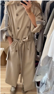 Beige Double - Breasted Trench Coat with Plaid Cuff Detail