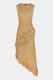 Sleeveless raffia dress with fringe detailing at the hem, and a self-lined interior for a smooth, considered finish.