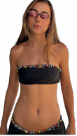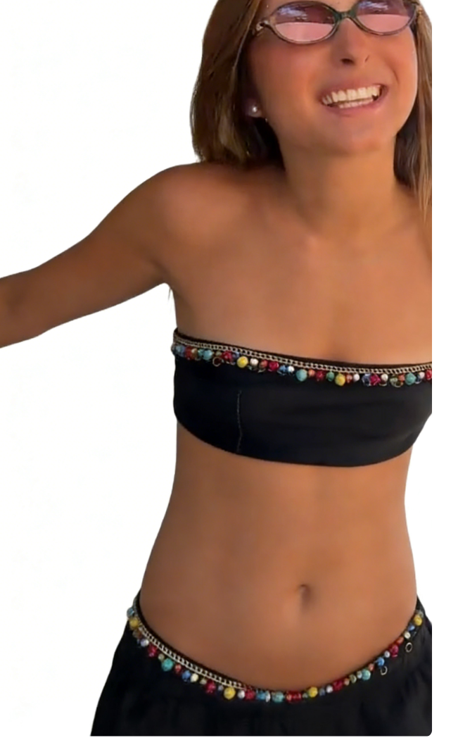 ✅ A black strapless top with colorful beaded trim, subtly eye-catching.
