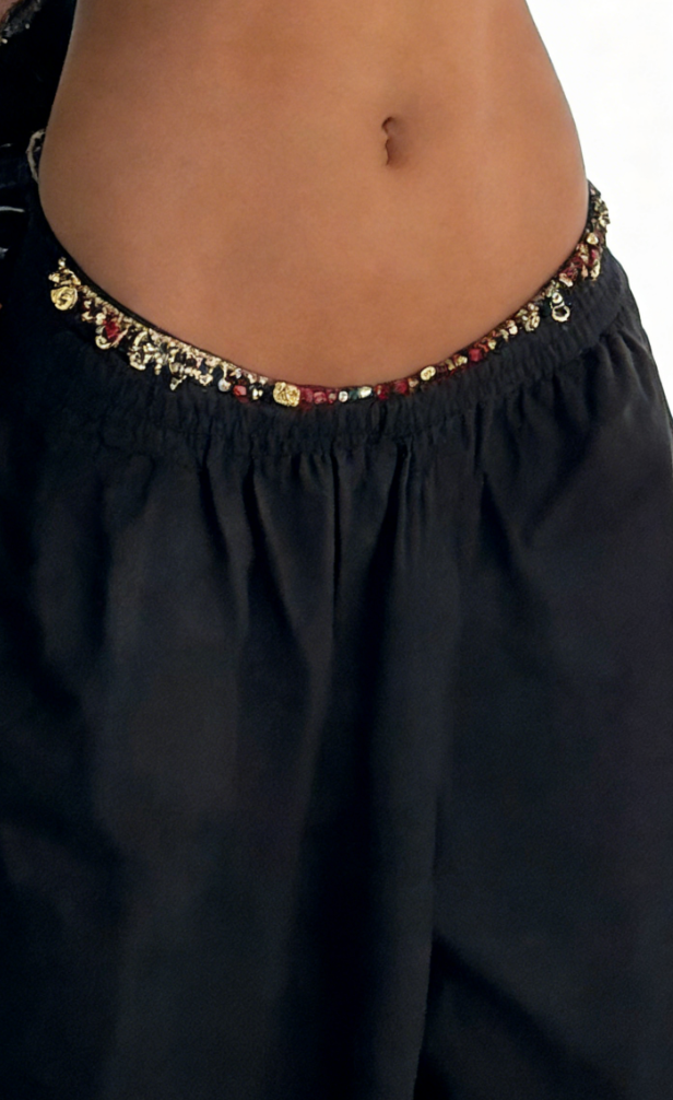 Black beaded strapless top and wide-leg pants set