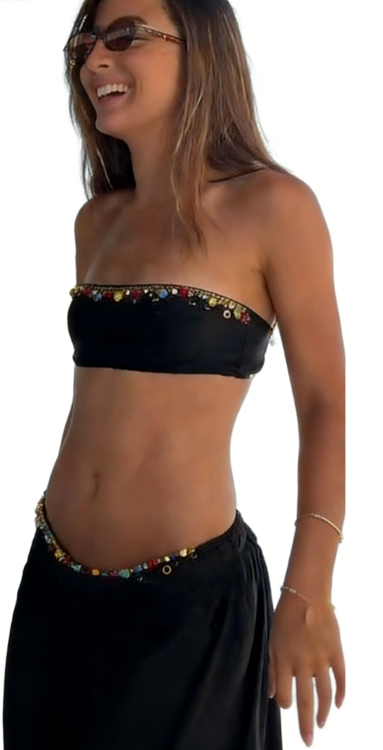 The black beaded strapless top and wide-leg pants set elevates the casual beach look with its playful details and effortless charm.