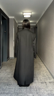 This black double-breasted long coat exudes elegance and style. Its slim, flowing silhouette and striking buttons create a powerful and chic look. The oversized cut adds a modern, casual feel without sacrificing sophistication.