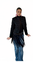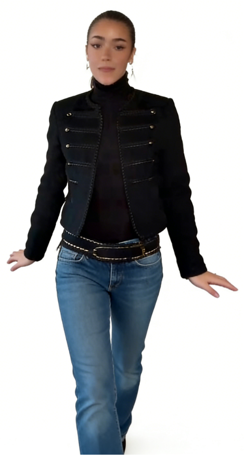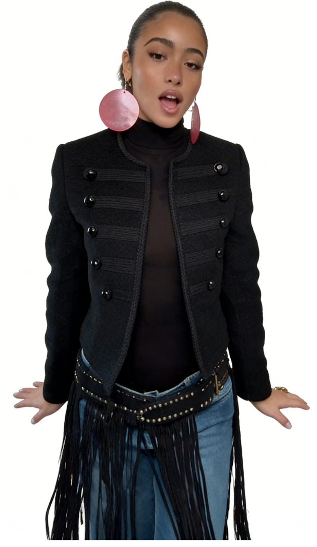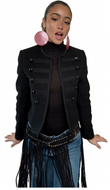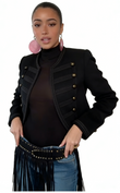 ✅ Black fabric with contrasting stitching and gold buttons creates a striking military style. ✅ The cropped silhouette with padded shoulders creates a clean and modern layered look. ✅ The double-button design adds a touch of tactical flair.