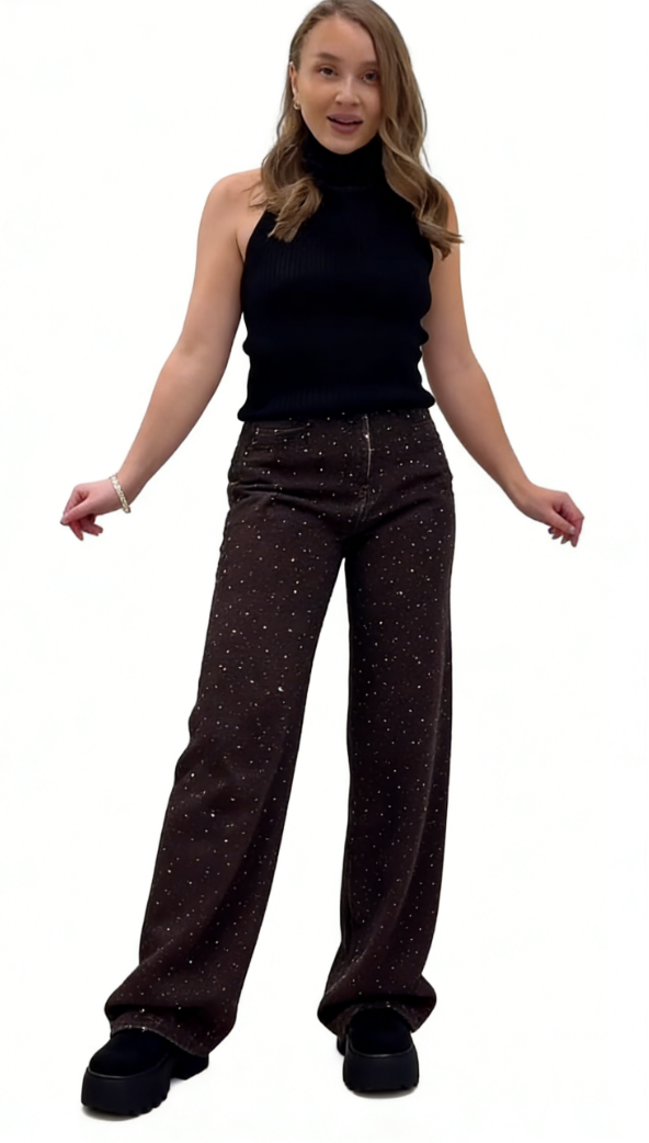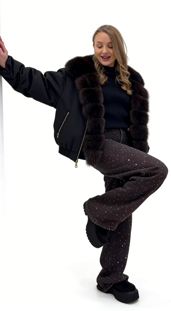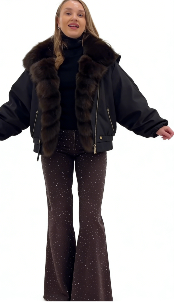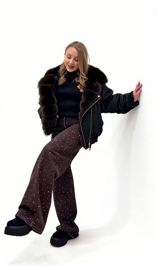 ✅ Two-piece set: Black satin bomber jacket (trimmed with soft faux fur) + dark brown sequined wide-leg trousers