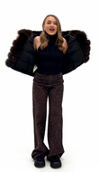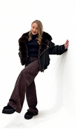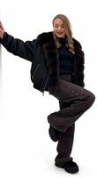 Black satin faux fur bomber jacket and sequined wide-leg trouser suit