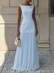 This dress is made of smooth fabric, features a pleated skirt, an elegant neckline, and a floor-length hem. Pair it with heels and delicate accessories for an effortlessly stylish look.