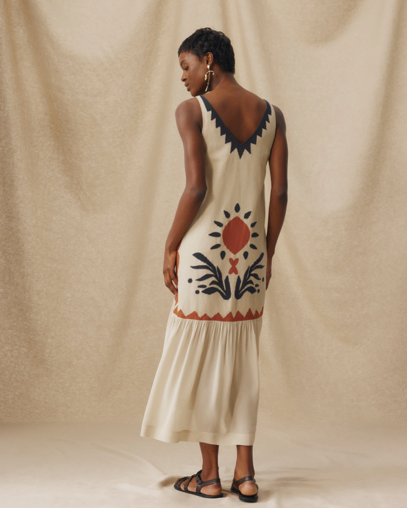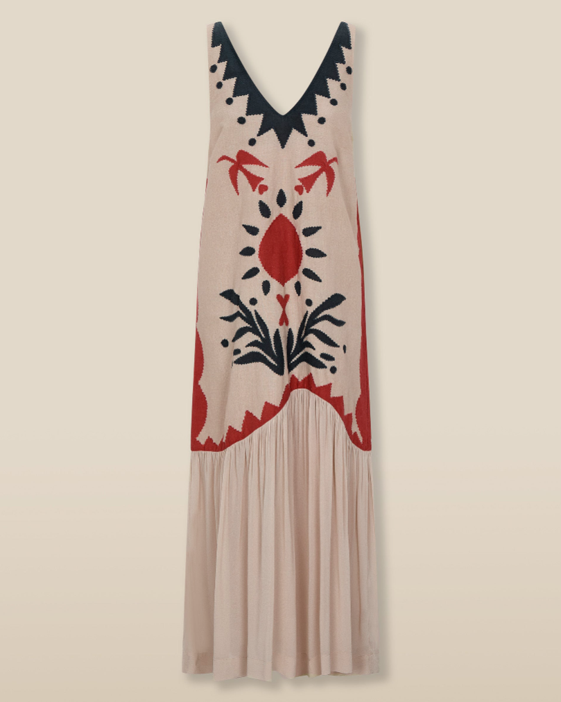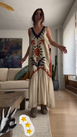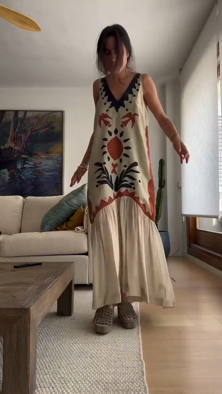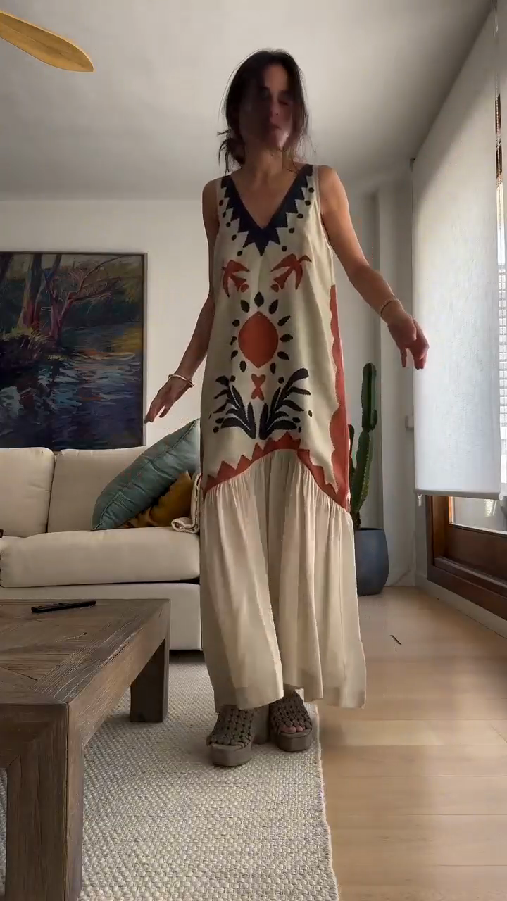 This bohemian print sleeveless midi dress elevates the casual bohemian style with its vibrant pattern and natural charm.