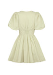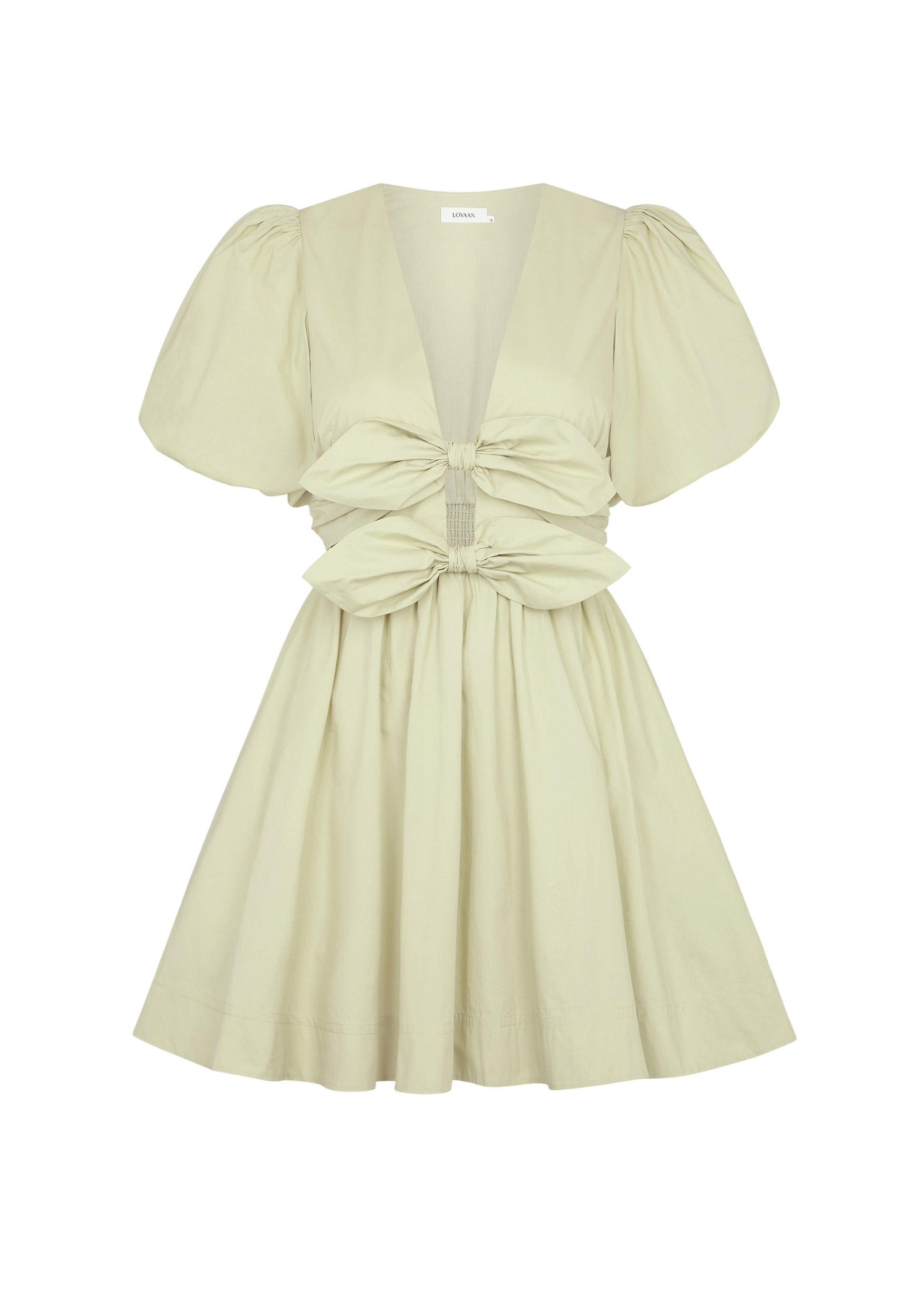 The Devon mini dress in pistachio is made from butter-soft cotton poplin, featuring double bow front details, blousy puff sleeves and a flattering deep V-front neckline.