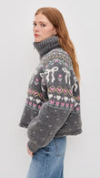 This knitted cardigan is crafted from a soft charcoal grey knit fabric, featuring a relaxed, cropped fit and a vibrant Fair Isle pattern. Pair it with high-waisted blue jeans and a white turtleneck sweater for an effortlessly casual autumn look.