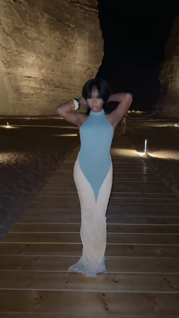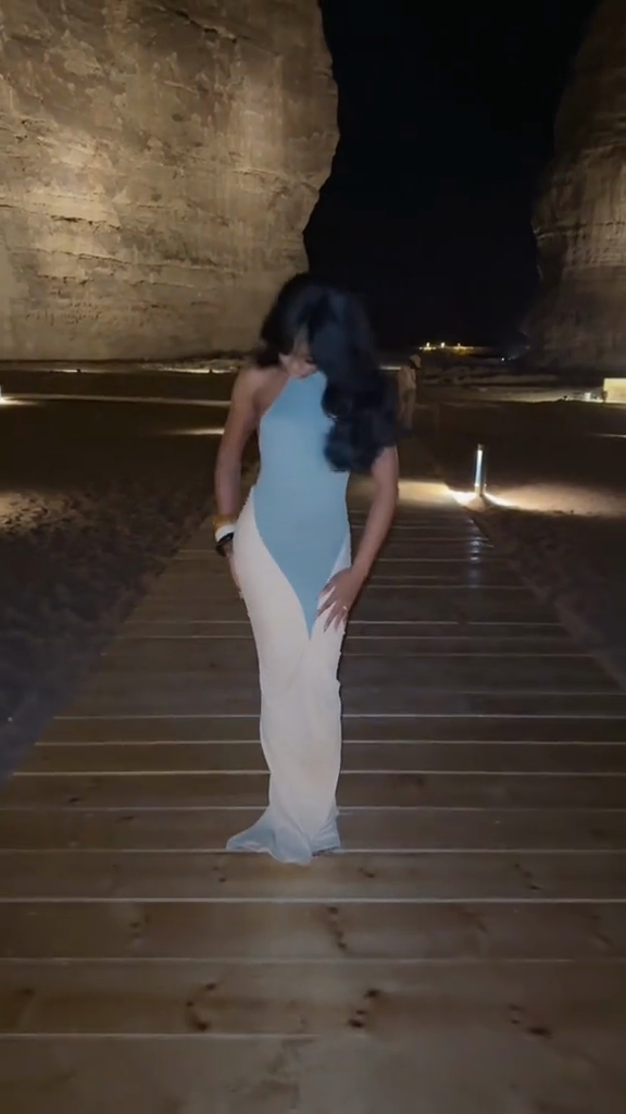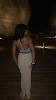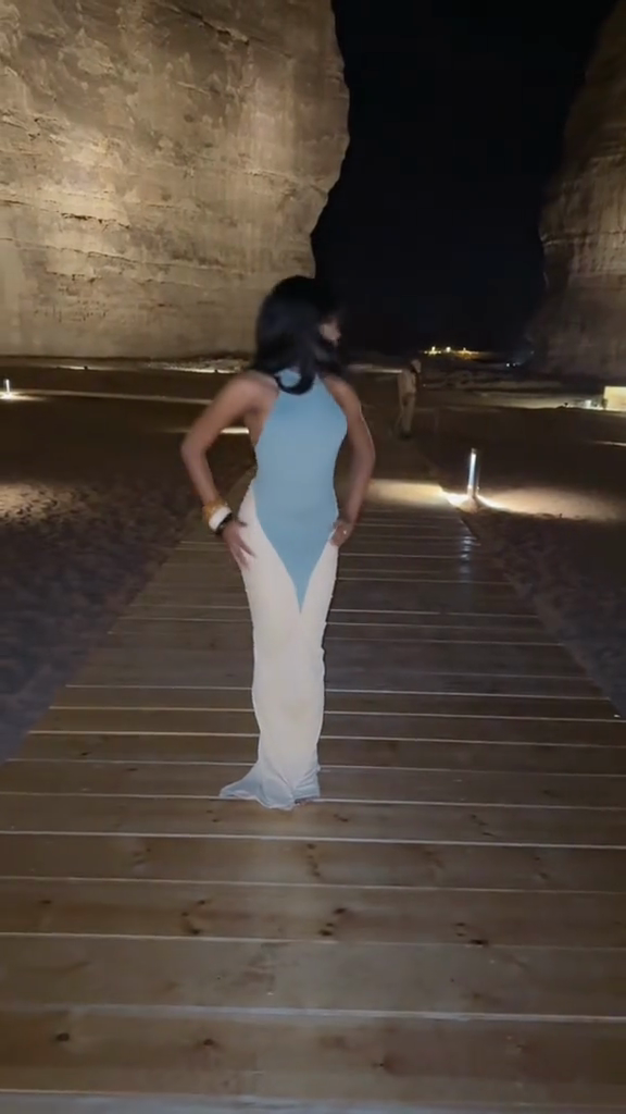 This dress features a backless neckline and a fitted, long silhouette. The light blue and beige tones create a soft, elegant contrast, while the tulle adds depth and dimension. Whether for formal occasions or scenic outdoor settings, this dress perfectly balances comfort and style.