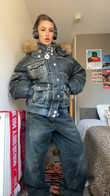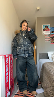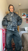 This down jacket is crafted from distressed dark washed denim, featuring a puffy silhouette, a soft fur collar, and contrasting white stitching. Pair it with matching wide-leg jeans and chunky boots for an effortlessly stylish look.