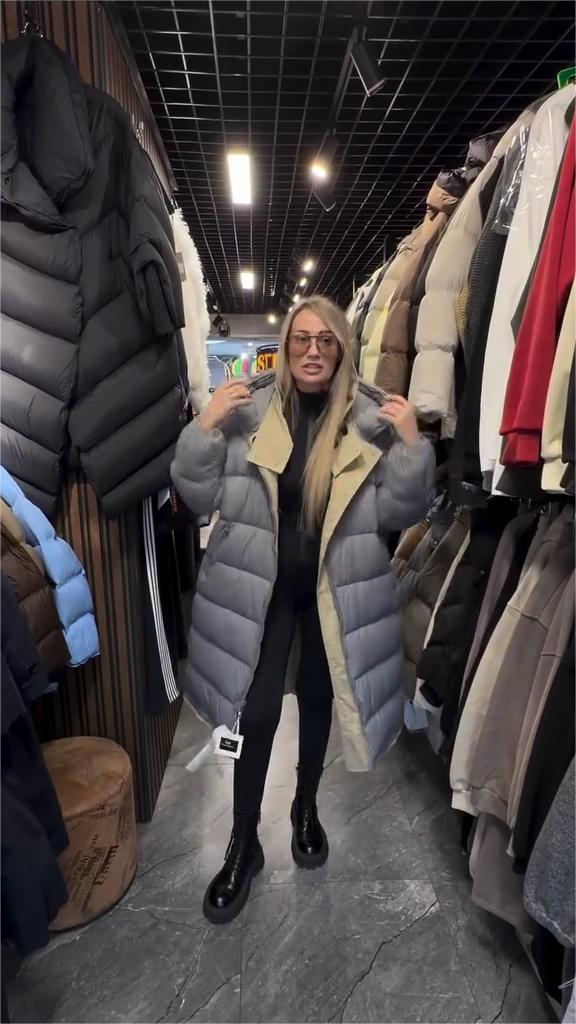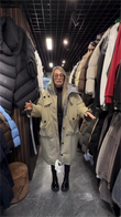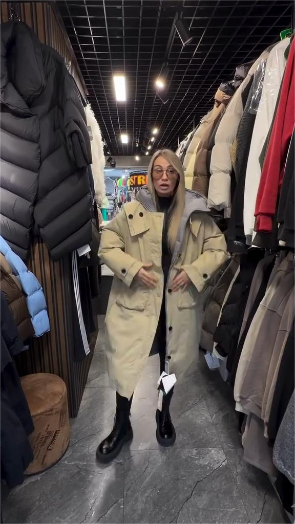 This coat is made from durable beige fabric (grey down on the reverse), featuring a mid-length, relaxed fit and practical button details. Pair it with black leggings and platform boots for an effortlessly versatile winter look.