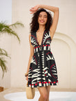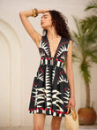 Geometric Graphic V-Neck Tie-Waist Zipper Sleeveless Dress
