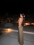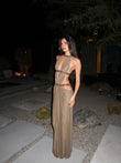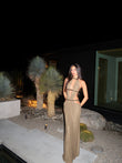This taupe-brown openwork maxi dress is crafted from smooth fabric and adorned with delicate openwork details. The halter neckline and floor-length skirt exude elegance. Pair it with heels and eye-catching accessories for a more sophisticated look.