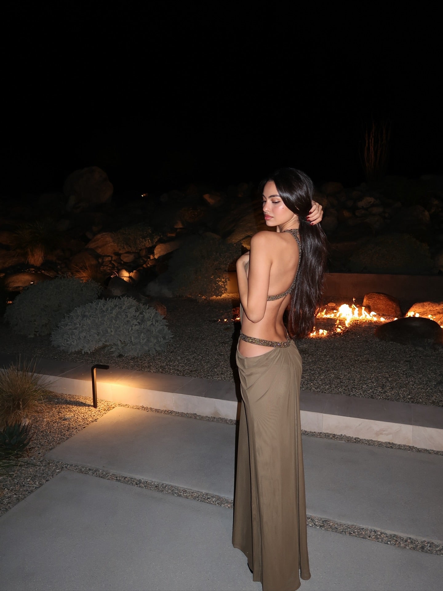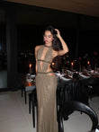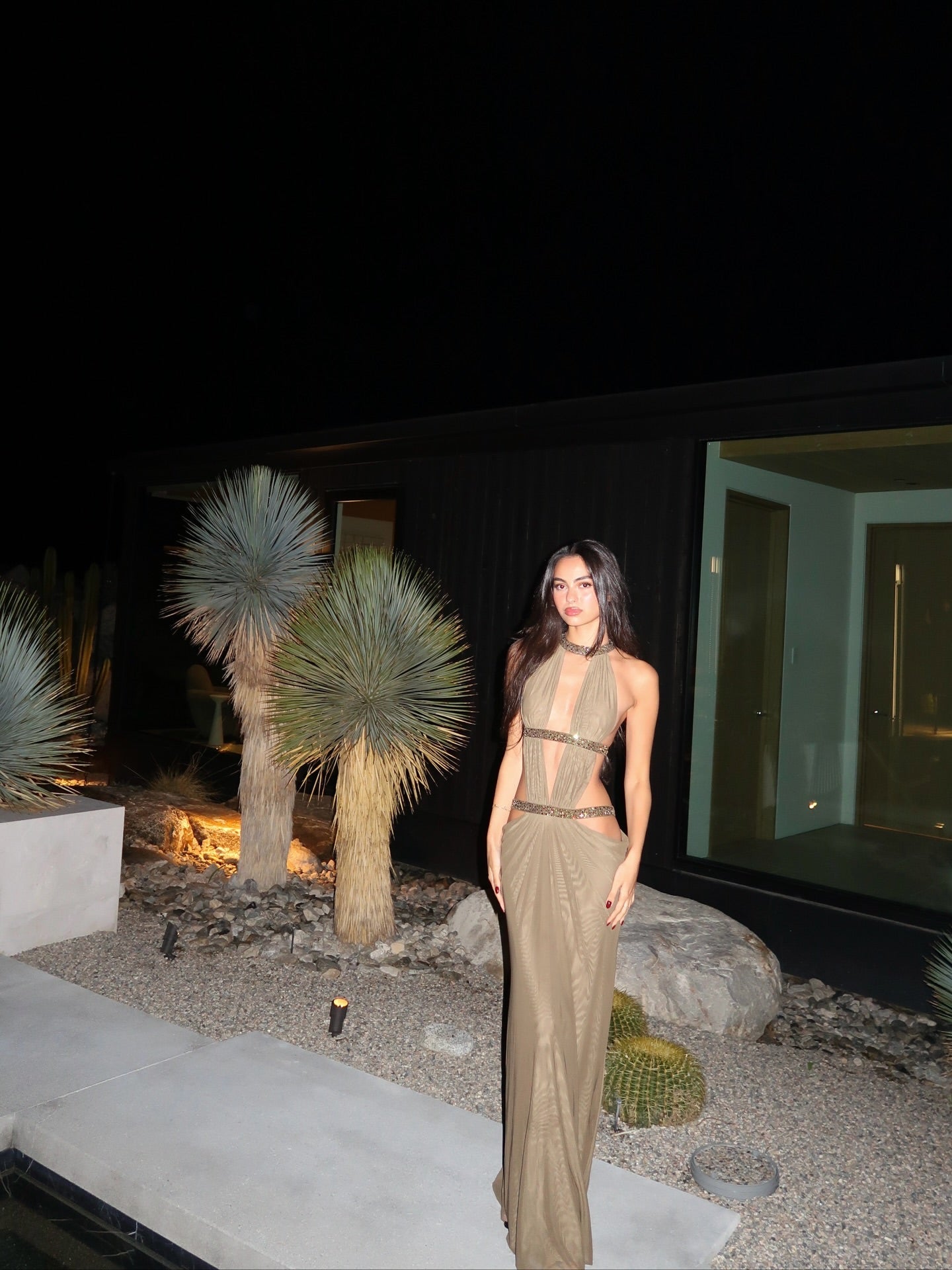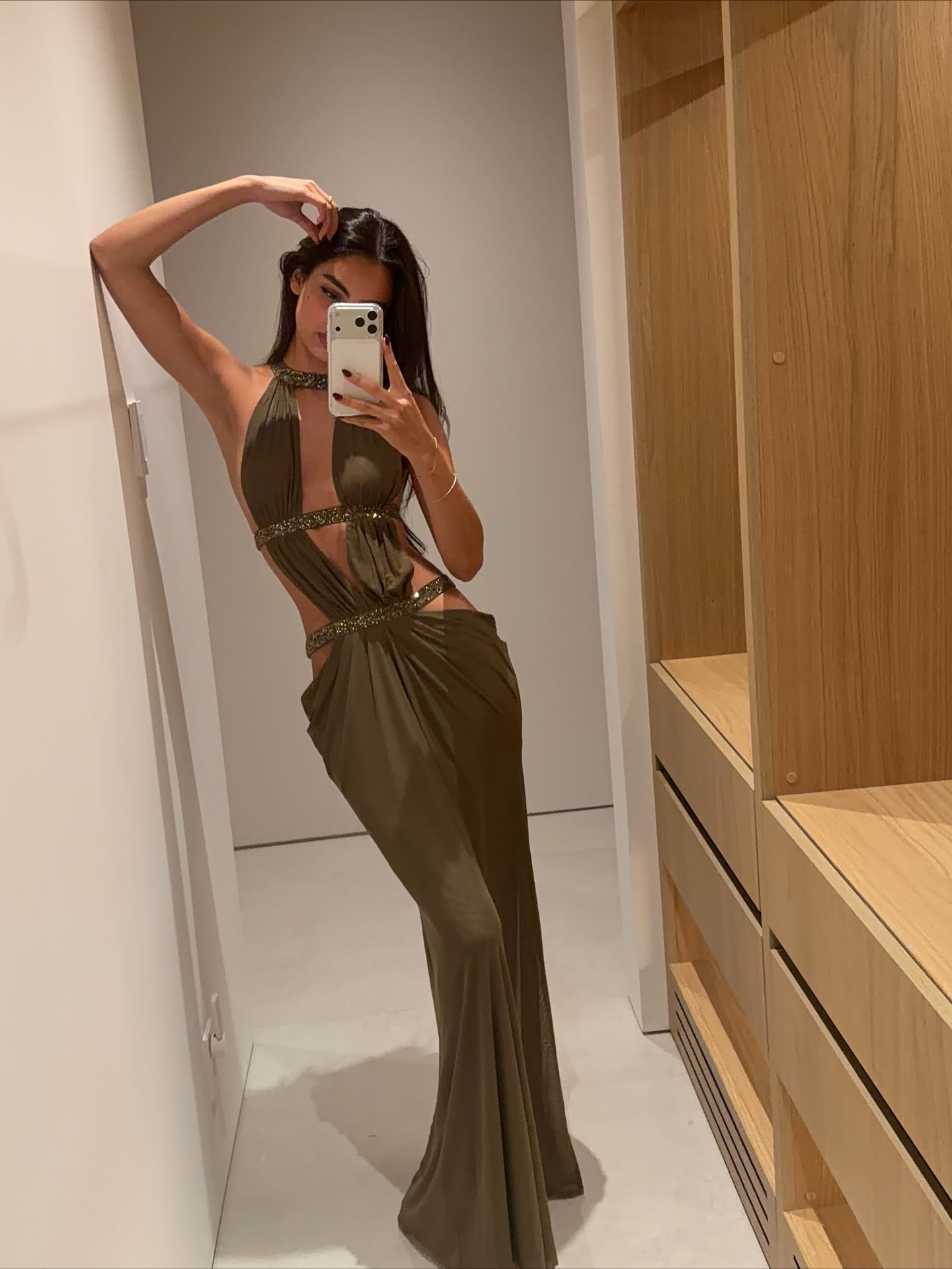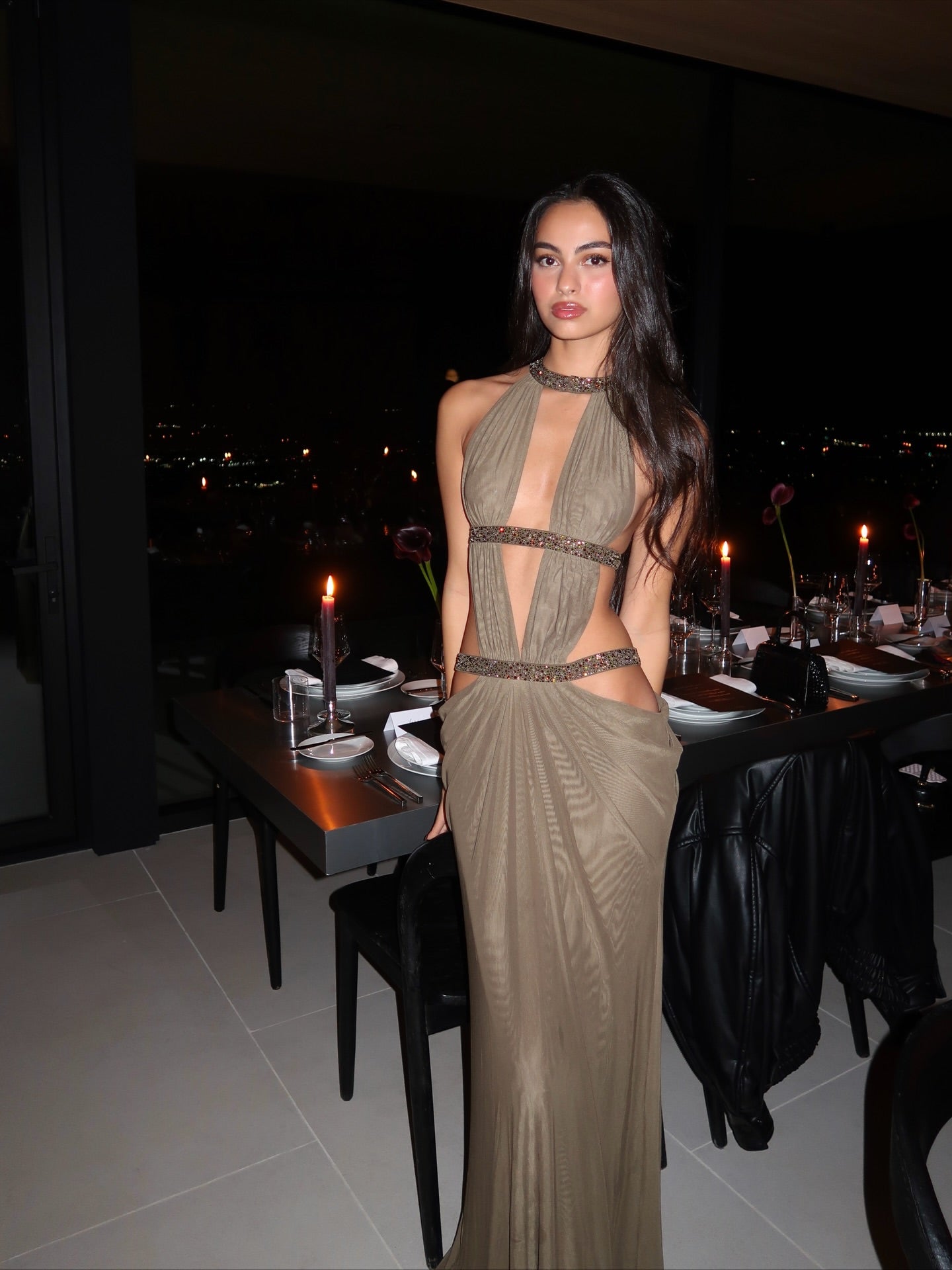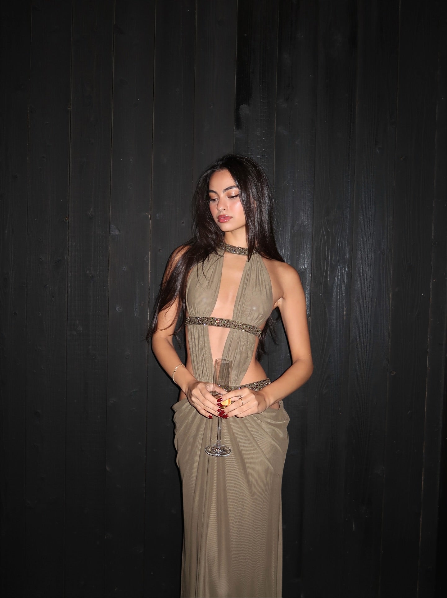 Grayish brown openwork embellished long dress