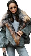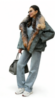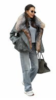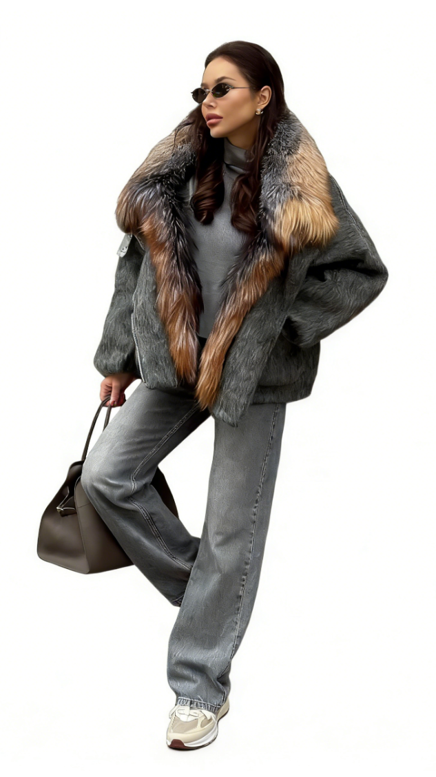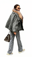 A grey faux fur coat paired with a colorful fur collar, with its soft texture and effortless sophistication, elevates a luxurious winter look.
