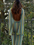 Unleash the joy of vacation adventures with our cheerful wavy striped crochet maxi dresses at our boutique. This backless maxi dress embodies the playful spirit of a getaway, featuring colorful vertical wavy stripe knit patterns reminiscent of a vibrant peacock's allure. Its ruffle-trimmed boat neck and enticing open back capture the essence of carefree beach escapades. With long sleeves donning delightful ruffled cuffs, the cozy yet free-spirited fit and semi-sheer fabric make it an ideal choice for a carefree, happy holiday outfit, ensuring you radiate an air of leisurely elegance.