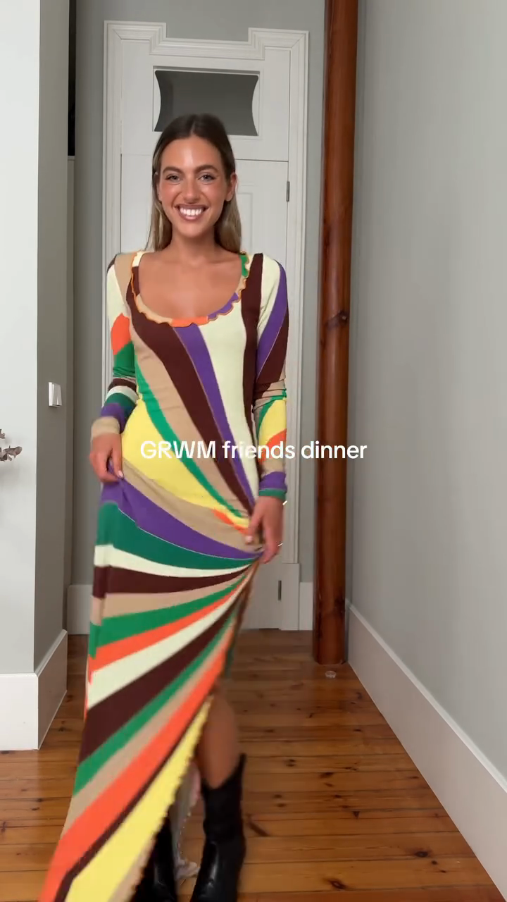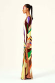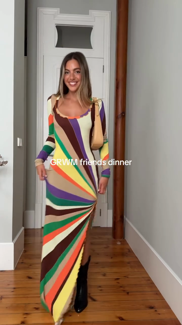 This maxi dress features a striking multi-colored striped pattern that radiates outward, creating a dynamic and eye-catching effect. The green, orange, purple, brown, and beige color combination lends it a lively, artistic feel. The long sleeves and slim fit add elegance and enhance the figure.