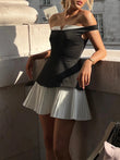 Patchwork Off Shoulder Pleated Mini Dress