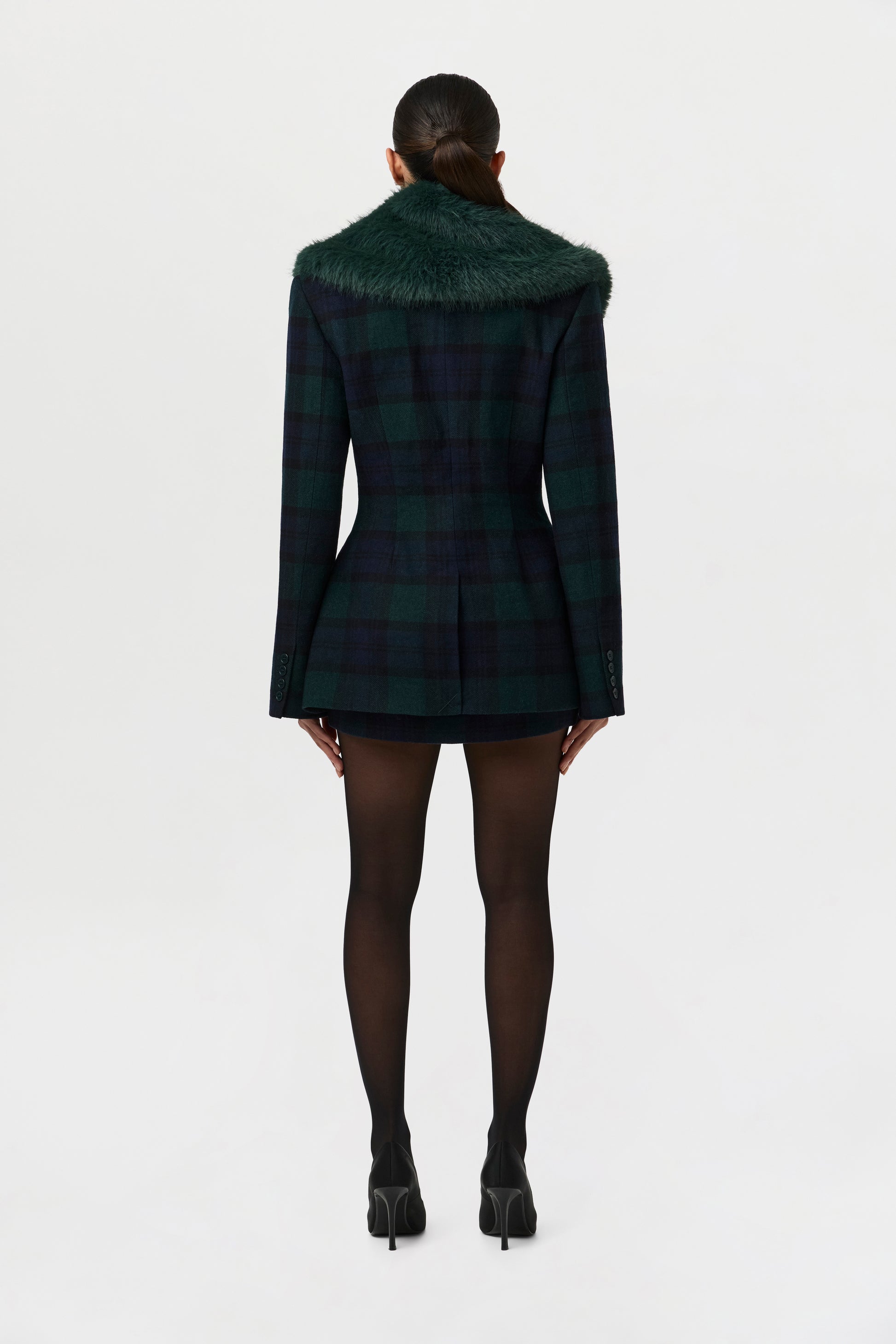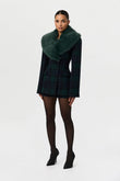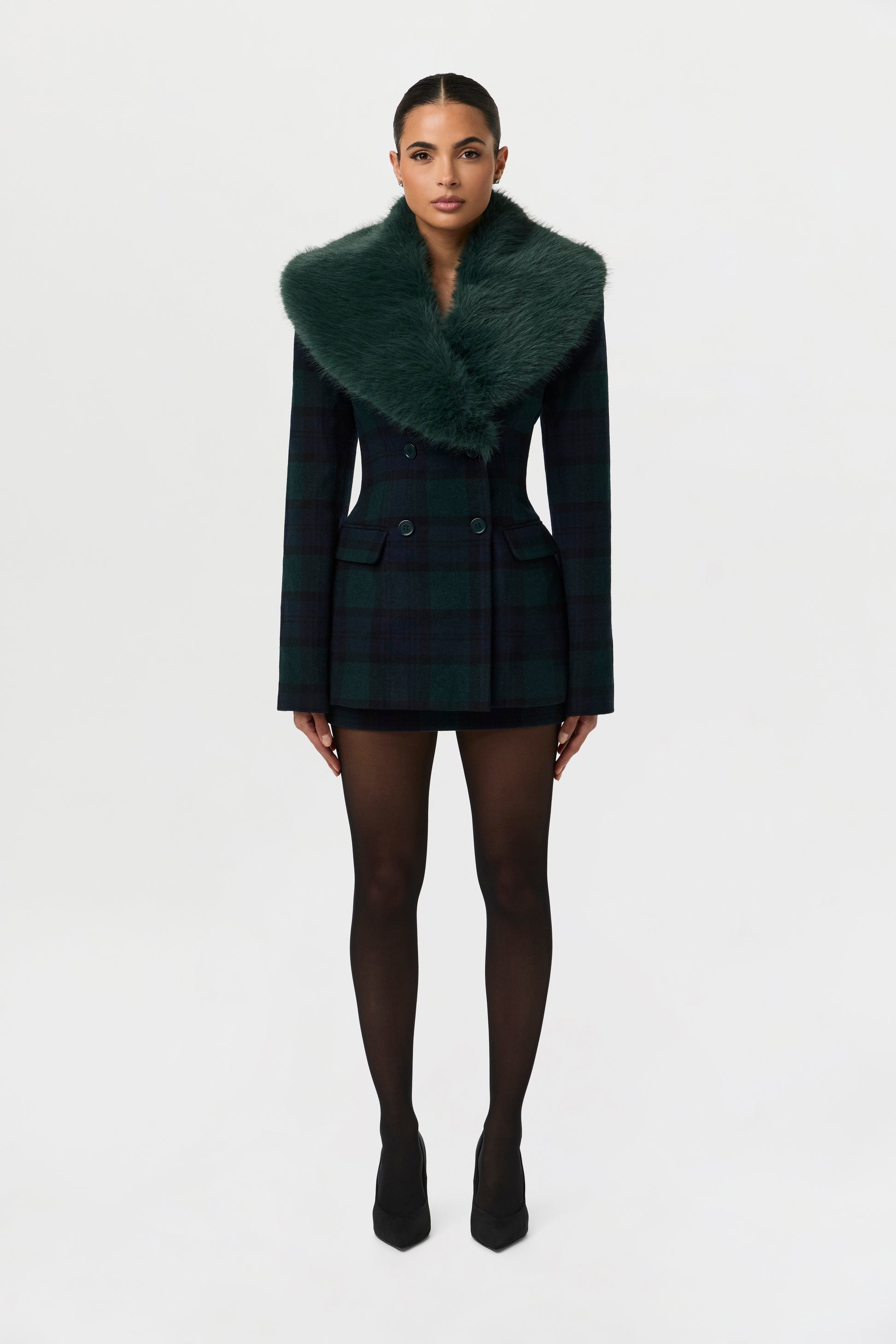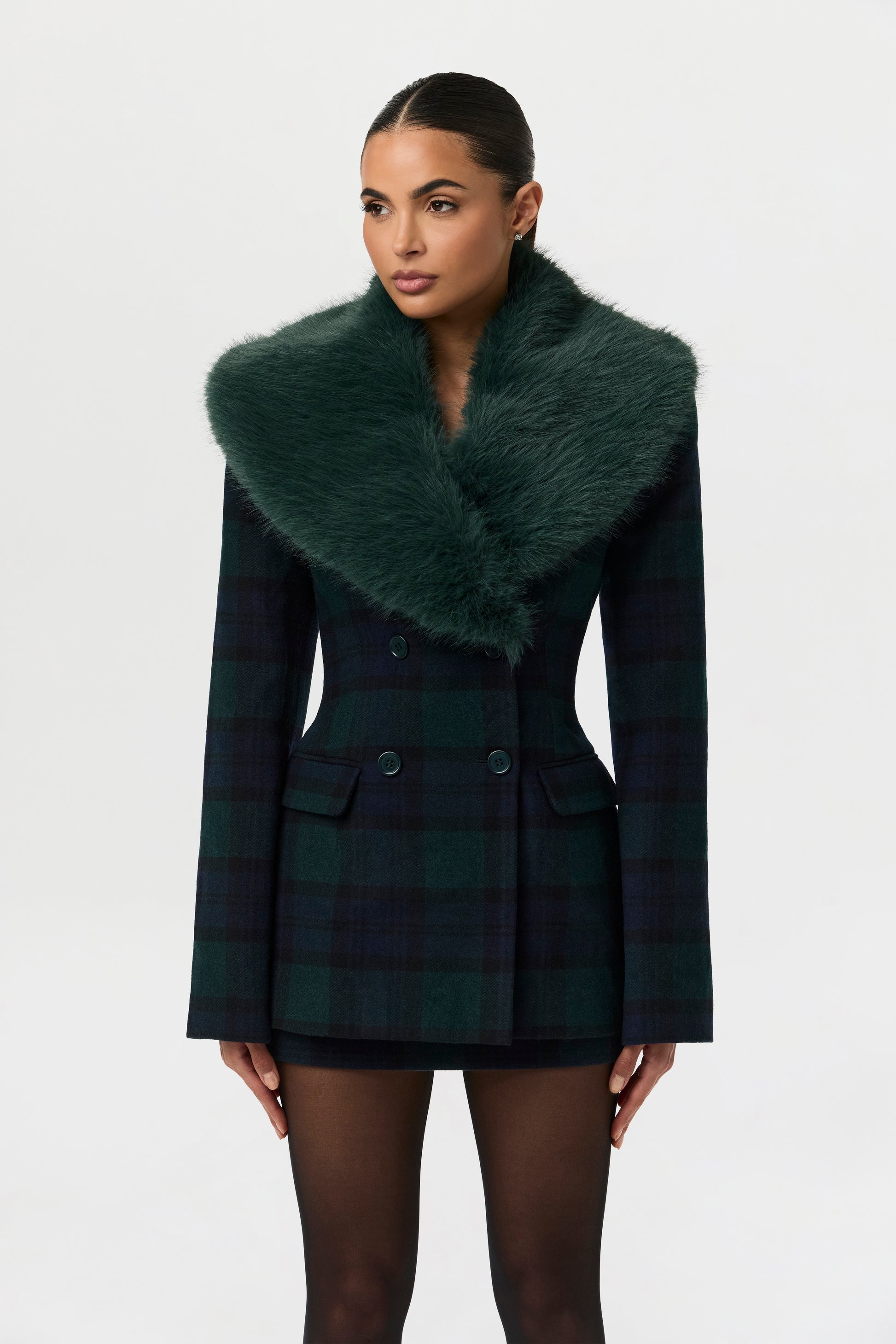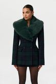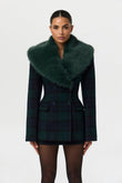 This slim-fit blazer is crafted from a refreshing forest green and navy blue plaid fabric, featuring a double-breasted design and a luxurious oversized forest green faux fur collar. Pair it with a matching mini skirt and sheer stockings for an elegant evening look.