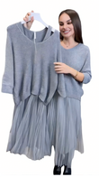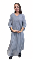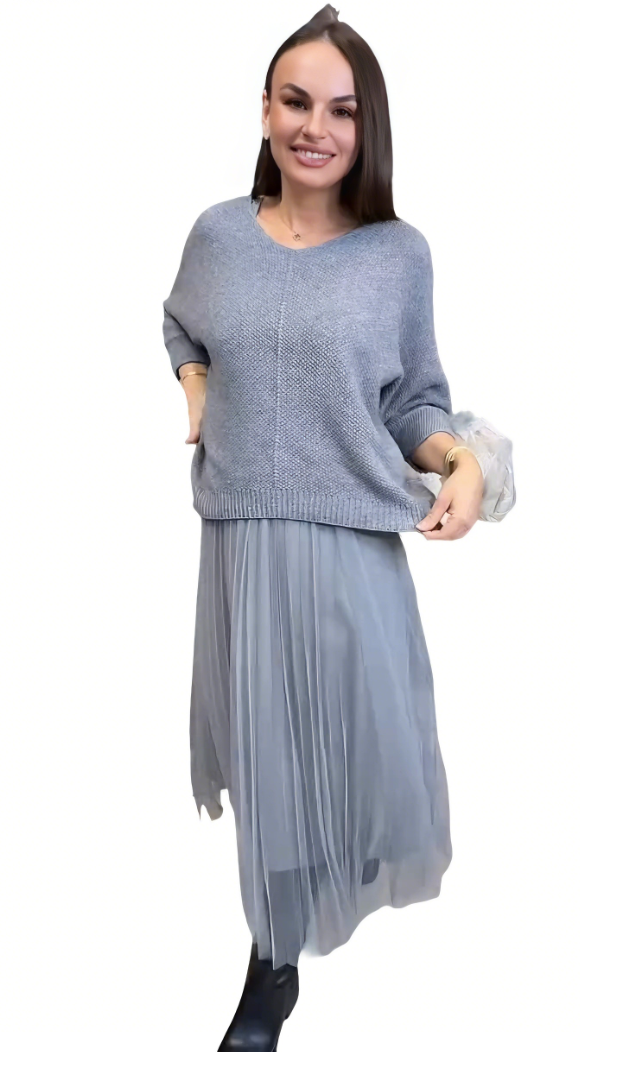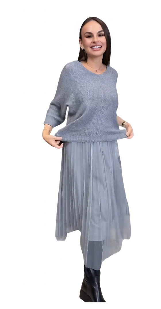A grey knit top paired with a pleated tulle slip dress aims to create a soft and elegant look through contrasting materials and overall harmony.