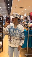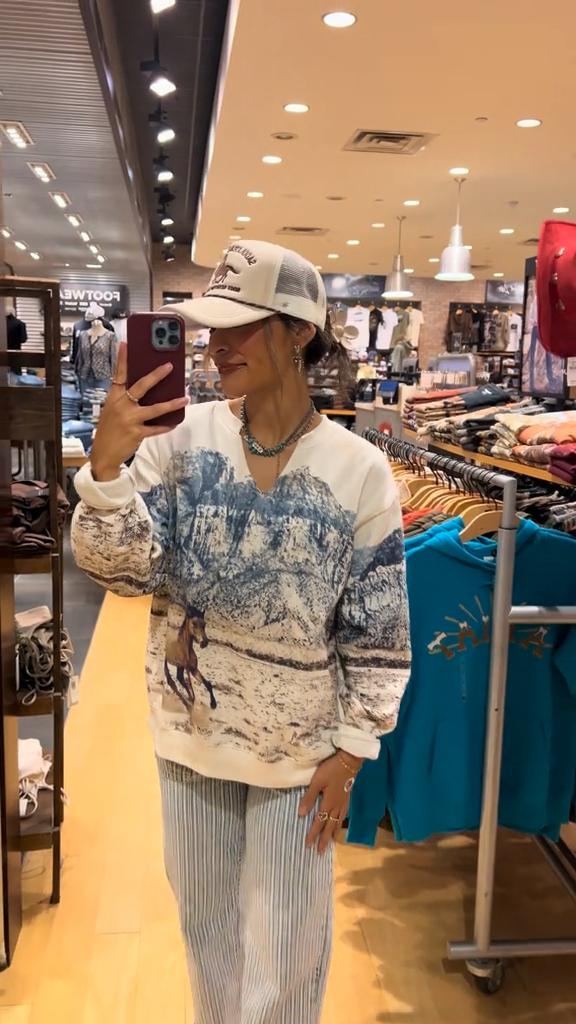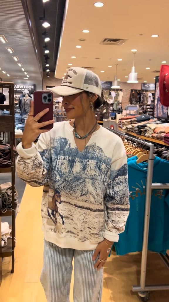 This V-neck sweatshirt features a striking print depicting majestic mountains and horses, creating an aesthetic that exudes adventure and country chic. The print extends across the front, becoming the focal point of the piece.