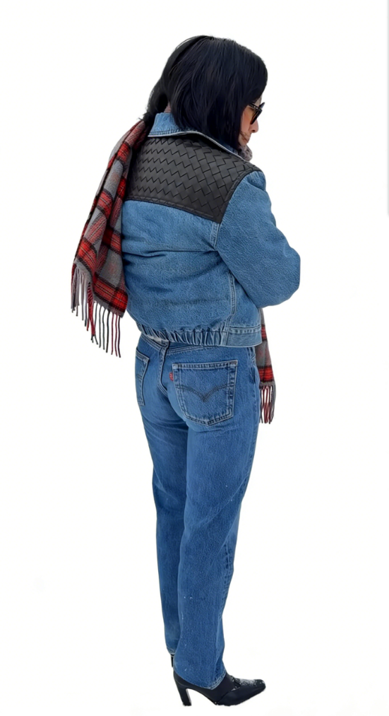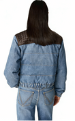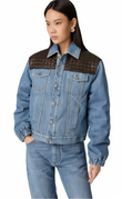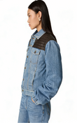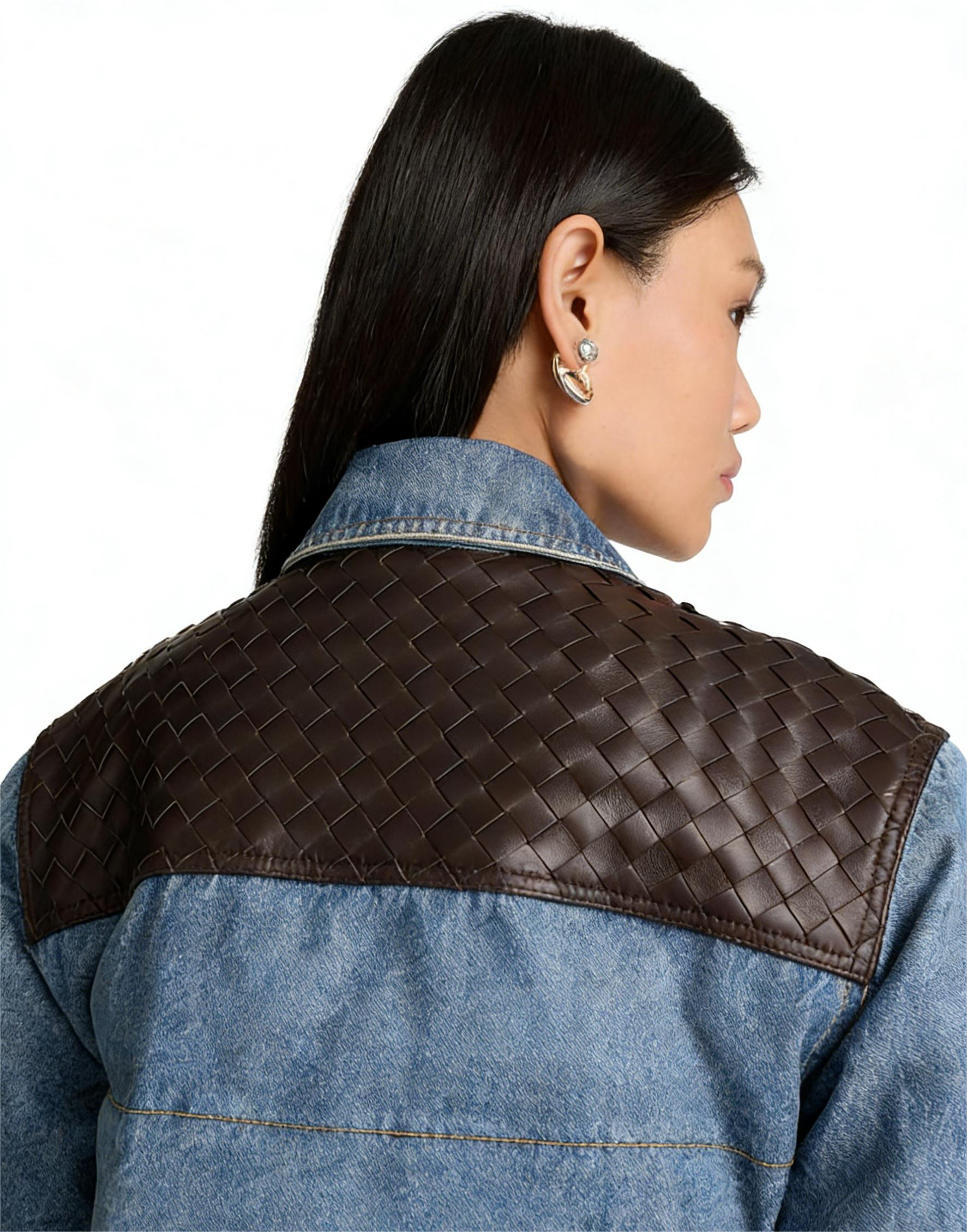 This denim jacket features woven leather shoulder panels, creating a luxurious contrast and an effortlessly sophisticated look that elevates a casual urban style.