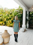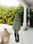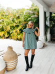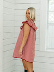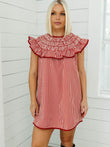 This dress, crafted from a crisp striped fabric, features a voluminous ruffled neckline and a relaxed, straight silhouette, perfectly blending playful charm with a classic pattern. Pair it with white sneakers and delicate silver jewelry for an effortlessly casual daytime look.