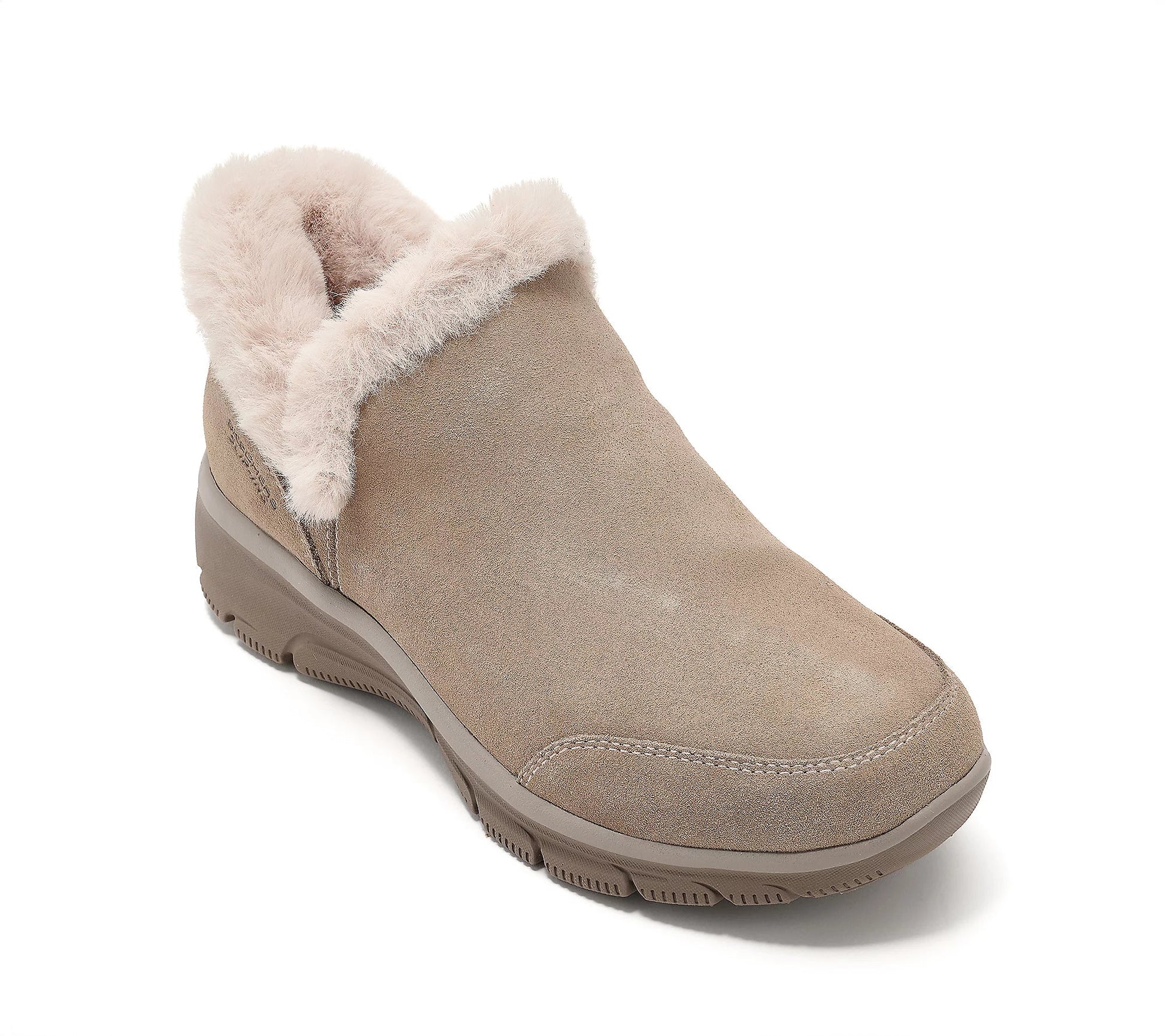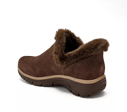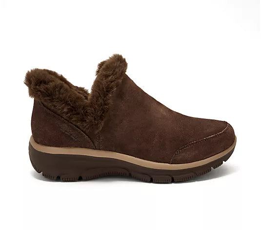Waterproof upper, slip-on style, relaxed fit, faux fur trim, suede upper