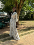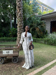 t pattern throughout. The plunging V-neckline and long sleeves add a touch of glamour and sophistication. The row of buttons on the front is both practical and aesthetically pleasing.