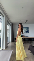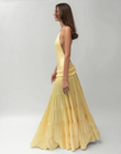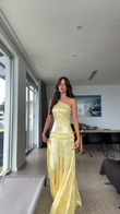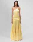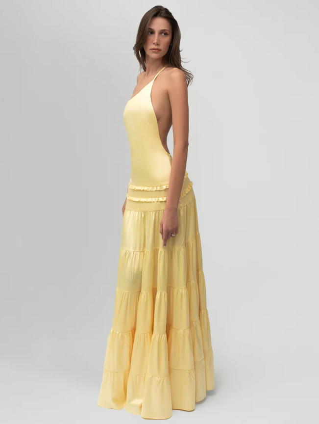 This yellow maxi dress features a one-shoulder design that elegantly accentuates the shoulders and collarbone. The bodycon bodice flatters and frames the figure, while the tiered skirt adds a touch of flow and romance. It's the perfect piece for special occasions.